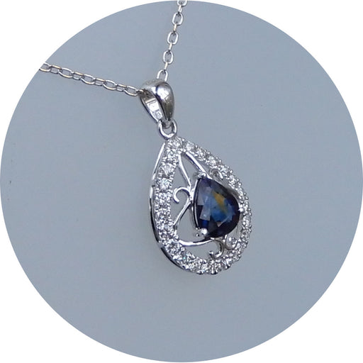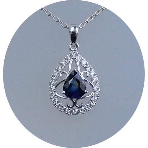 Alle gegevens bekijkenHanger, Saffier, Diamant, 18K Witgoud 18krt. witgouden peervormige hanger en collier met saffier en diamant. Slijpsel: pendeloque gemengd & b...