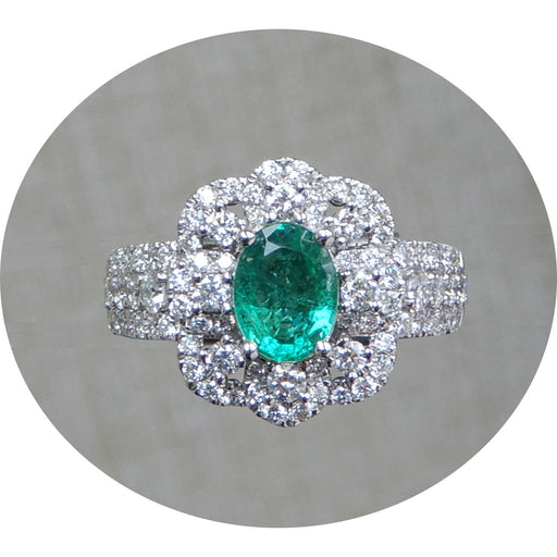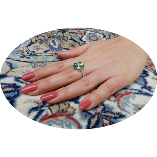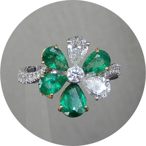 Alle gegevens bekijkenRing, Bloem, Smaragd, Diamant, 18K 18krt. witgouden ring met bloemmotief, bezet met smaragd en diamant. Slijpsel: druppelvorm gemengd & brilj...