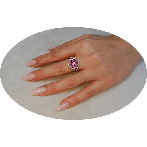 Ring, Robijn, Diamant, 18krt. Witgoud 18krt. witgouden rozet ring met robijn en diamant. Slijpsel: ovaal gemengd & briljant Carat: circa 1,32...
