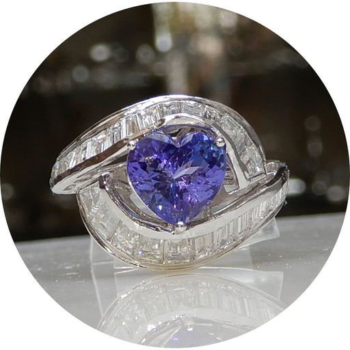 Alle gegevens bekijkenRing, Tanzaniet, Diamant, 18K 18krt. witgouden ring met een hartvormige tanzaniet omgeven door baguette diamanten, de scheen geheel bezet met bague...