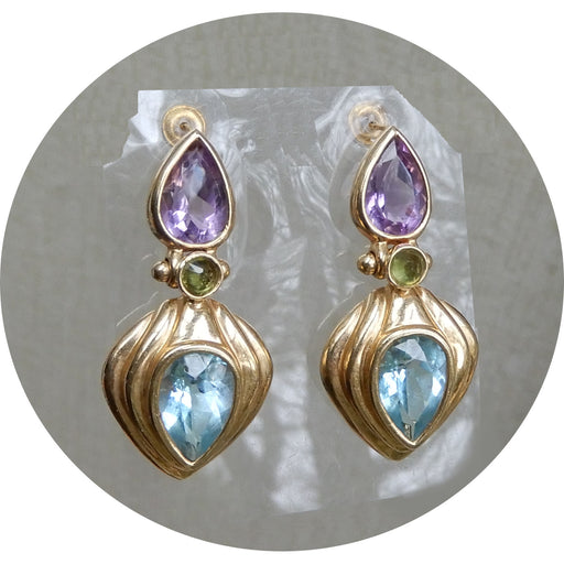 De Gouden EeuwOorhangers, Topaas, Amethist, 14K Goud 14krt. geelgouden oorhangers met topaas, amethist en peridot. Lengte: 4 cm Breedte: 2 cm Gewicht: 12,9 gra...