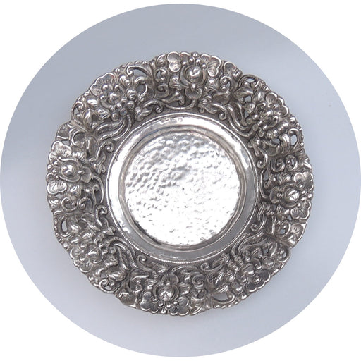 De Gouden EeuwDjokja zilveren schaaltje, rond model, binnenin gehamerd en de rand met koord- en lotusbloem-motief. Gehalte: 800/000 (= derde gehalte zilver) Ge...