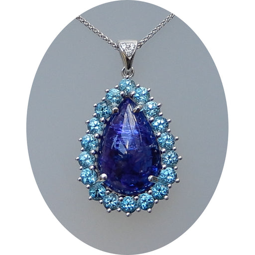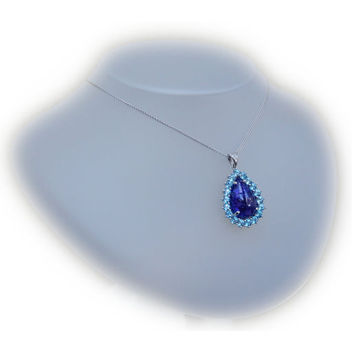 De Gouden EeuwHanger, Tanzaniet, Zirkoon, 18K Witgoud 18krt. witgouden peervormige hanger en collier met tanzaniet, omgeven door natuurlijke blauwe zirkoon, de h...