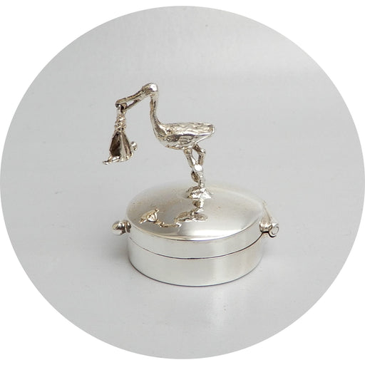 De Gouden EeuwMiniatuur zilveren tandendoosje, ooievaar met baby. Product alleen in winkel te Oegstgeest verkrijgbaar Gehalte: 925/000 (= eerste gehalte zilver) ...