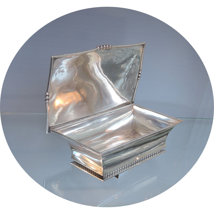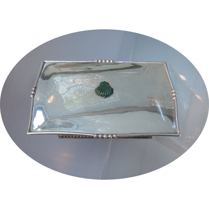 Rechthoekige zilveren koektrommel met op de deksel een schelpvormige malachiet edelsteen.