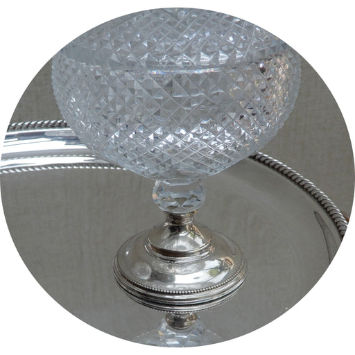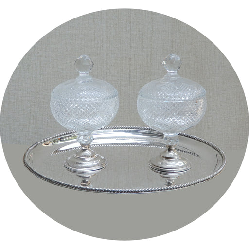 De Gouden EeuwCoupes, Kristal, Antiek Een paar kristallen coupes, diamantslijpsel, met afneembaar deksel, staand op zilveren voet. Gehalte: 835/000 (= tweede g...