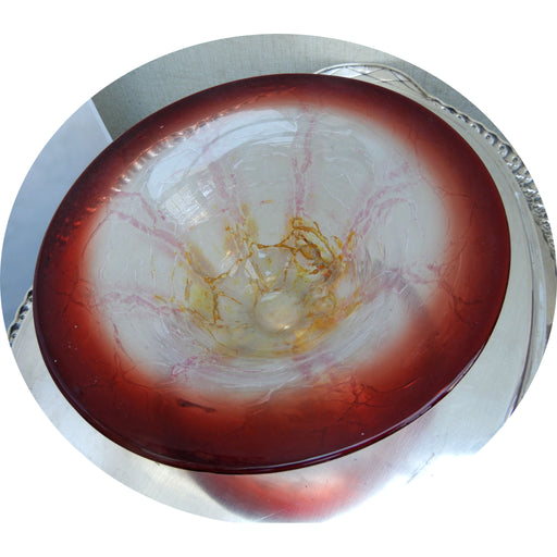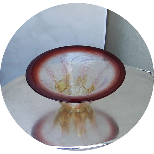 De Gouden EeuwArt-deco glazen fruitschaal met gekleurd glas (rood, geel, wit). Afmetingen: H.8 x Diam. 19 cm. Ontwerp: Karl Wiedmann, voor WMF Herkomst: Duitslan...