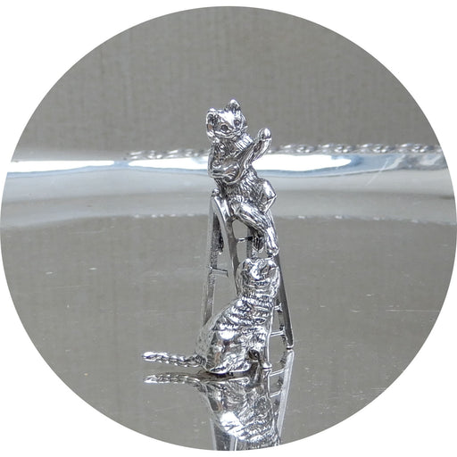 De Gouden EeuwZilveren miniatuur, twee katjes, met trap en muziekintrument, Banjo. Gehalte: 835/000 (= tweede gehalte zilver) Meesterteken: Argentor edelmetaal...