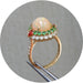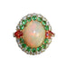 18krt. geelgouden ring met opaal en dubbel entourage van tsavoriet, rode spinel en diamant.
