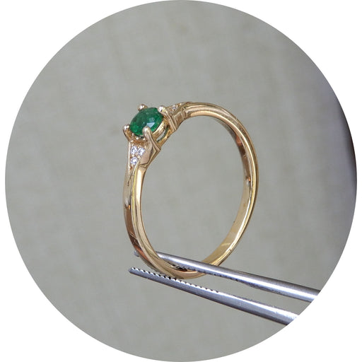 De Gouden EeuwRing, Smaragd, Diamant, 14K 14krt. geelgouden ring met smaragd en diamant. Slijpsel: rond gemengd & briljant Carat: circa 0,15 ct. smaragd en...