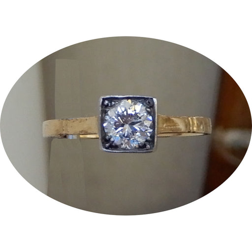 De Gouden EeuwRing, Diamant, Solitair, 14K, Vintage 14krt. geelgouden ring met solitair diamant, in vierkante zetting met zilver (925/000). VERKOCHT Slijpsel: br...