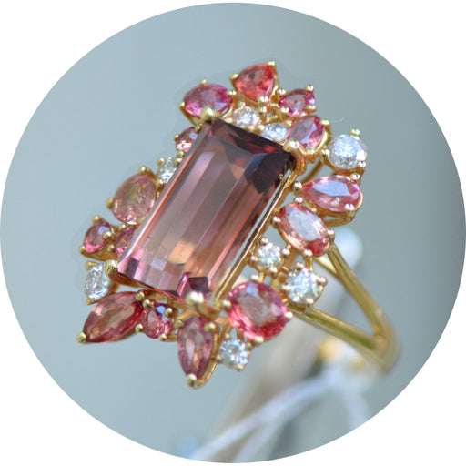 De Gouden EeuwRing, Toermalijn, Saffier, Diamant, 18K 18krt. geelgouden ring met fancy color toermalijn, roze/rood, en entourage van licht- en donker-oranje saff...