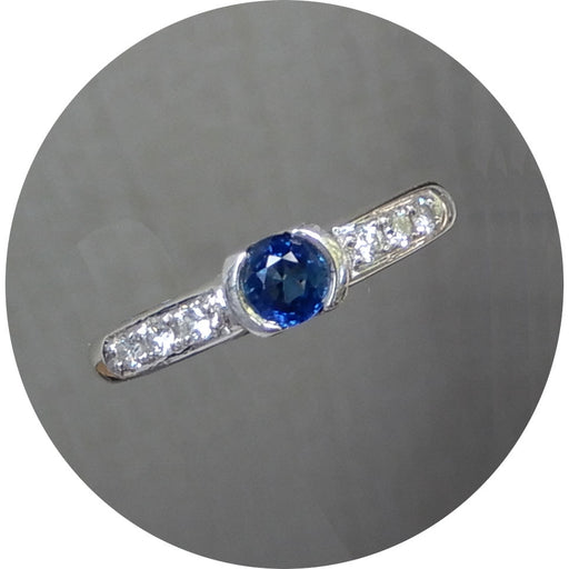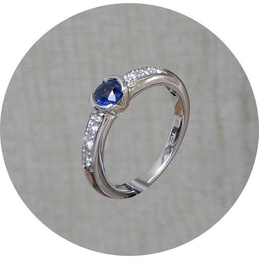 De Gouden EeuwRing, Saffier, 18Krt. Witgoud 18krt. witgouden ring met saffier en diamant. Slijpsel: rond gemengd & briljant Carat: circa 0,39 ct. saffier (...