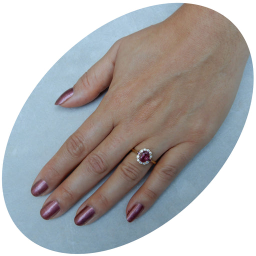 De Gouden EeuwRing, Robijn, Diamant, Cornucopia, Vintage 14krt. rosé gouden ring met robijn en diamant, Cornucopia, in fraaie zettingen met millegrain. Slijpse...