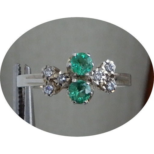 De Gouden EeuwRing, Smaragd, Diamant, X2, 14K Witgoud 14krt. witgouden ring met twee smaragden en aan weerszijden 3 diamanten. Slijpsel: rond gemengd & acht...