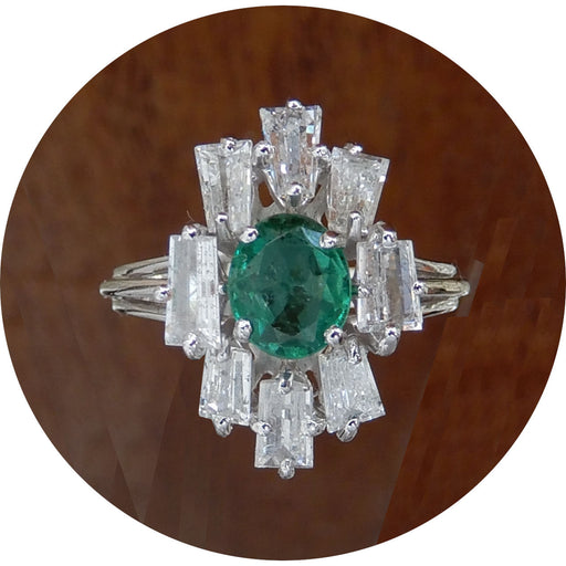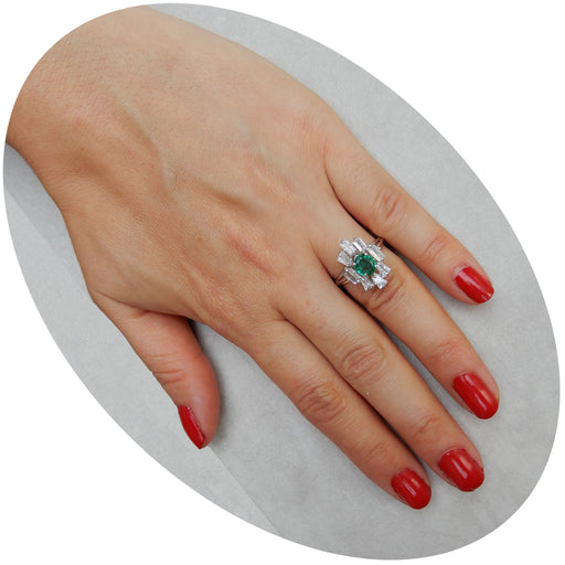 De Gouden EeuwRing, Smaragd, Diamant, 18K 18krt. witgouden rozetring met smaragd en diamant. Slijpsel: baguette & briljant Carat: circa 0,41 ct. smarag...