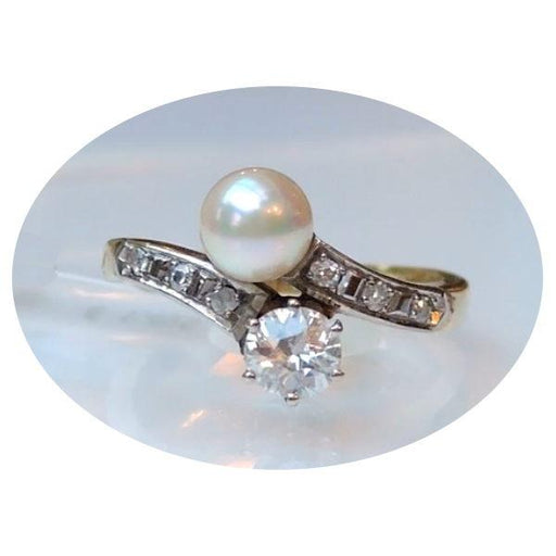 De Gouden EeuwSlagring, Parel, Diamant, 14K Goud 14krt. geelgouden slagring met een oudslijpsel diamant, een cultivé parel en aan weerszijden 2 x 3 achtkant diam...