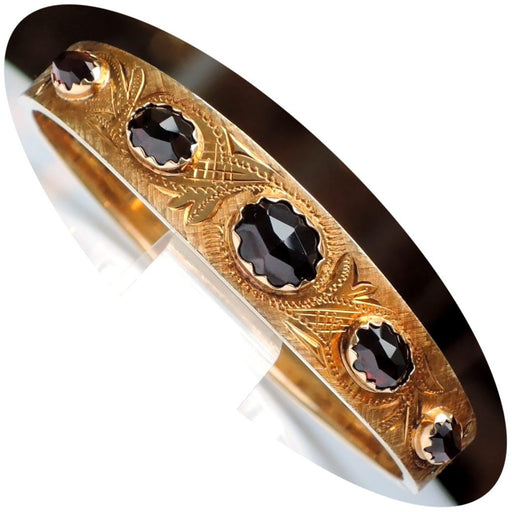 De Gouden EeuwArmband, Granaat, 14K Goud 14krt. geelgouden armband, gegraveerd, bezet met 5 gefacetteerde granaten, aflopend in grootte, scharnierend en met geïn...