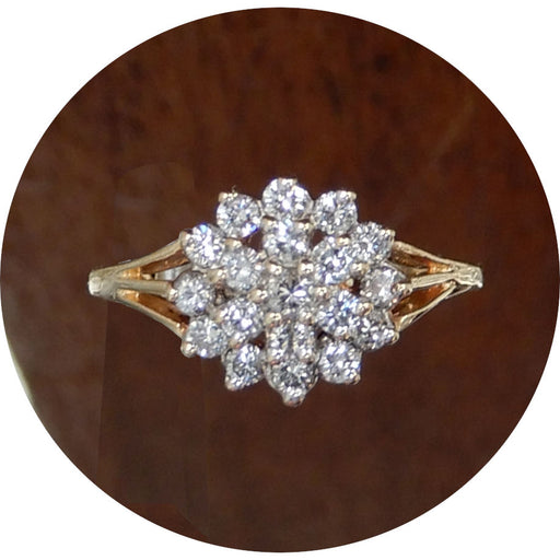 De Gouden EeuwRozetring, Diamant, 14K Goud 14krt. geelgouden rozetring met 19 diamanten, in witgoud gezet. VERKOCHT Slijpsel: briljant Carat: circa 0,38 ct. diam...