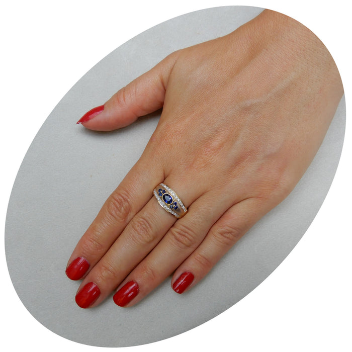 14krt. wit- en geelgouden bandring met saffier en twee rijen diamant.