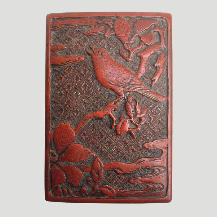 Chinese rechthoekige lakdoos met afbeelding van vogel en bloemen, de zijkant met meander motief.