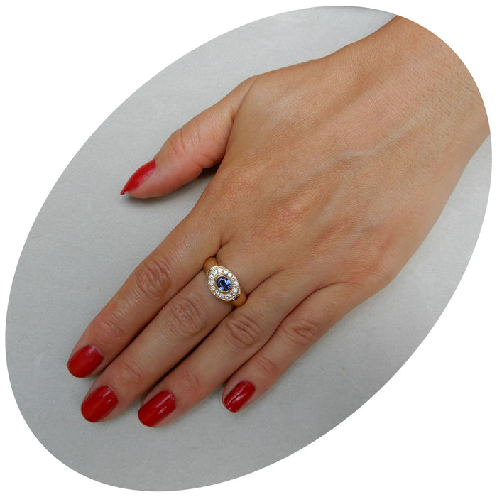 14krt. geelgouden ring met ceylon saffier, omgeven door briljant-geslepen diamanten, de scheen glad.
