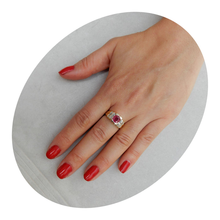 18krt. geelgouden bandring met robijn, geflankeerd door baguette diamanten.