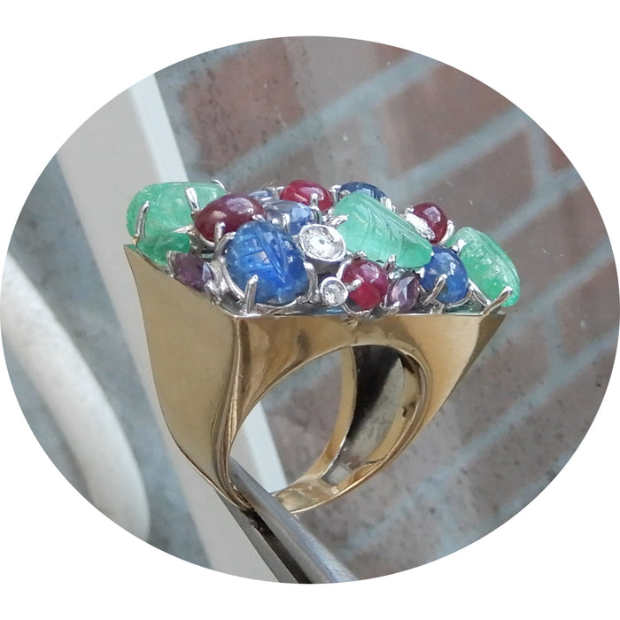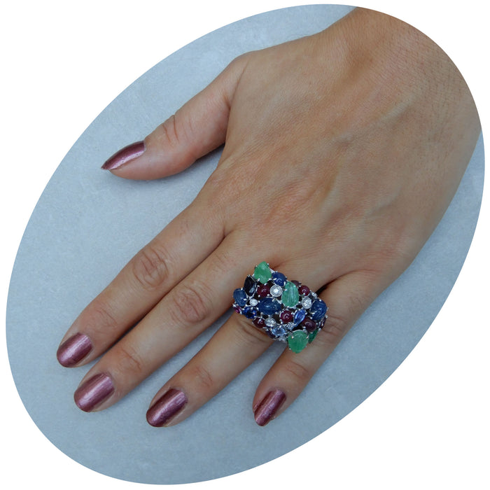 14krt. geelgouden ring, Tutti Frutti, bezet met saffier, robijn, smaragd en diamant, in witgoud gezet.