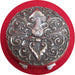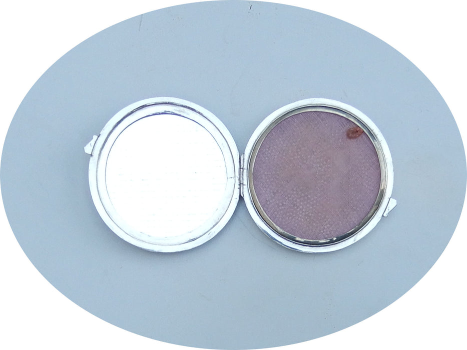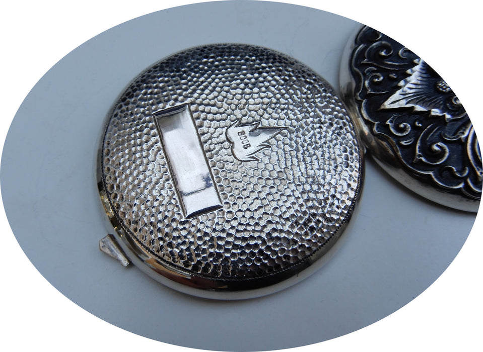 Ronde zilveren djokja poederdoos, lotusbloemmotief, met scharnier en sluiting.