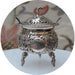 Zilveren pomander met hengsels en afneembaar deksel, de binnenzijde verguld, staande op drie pootjes.